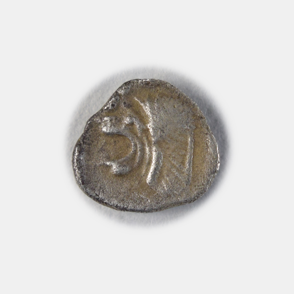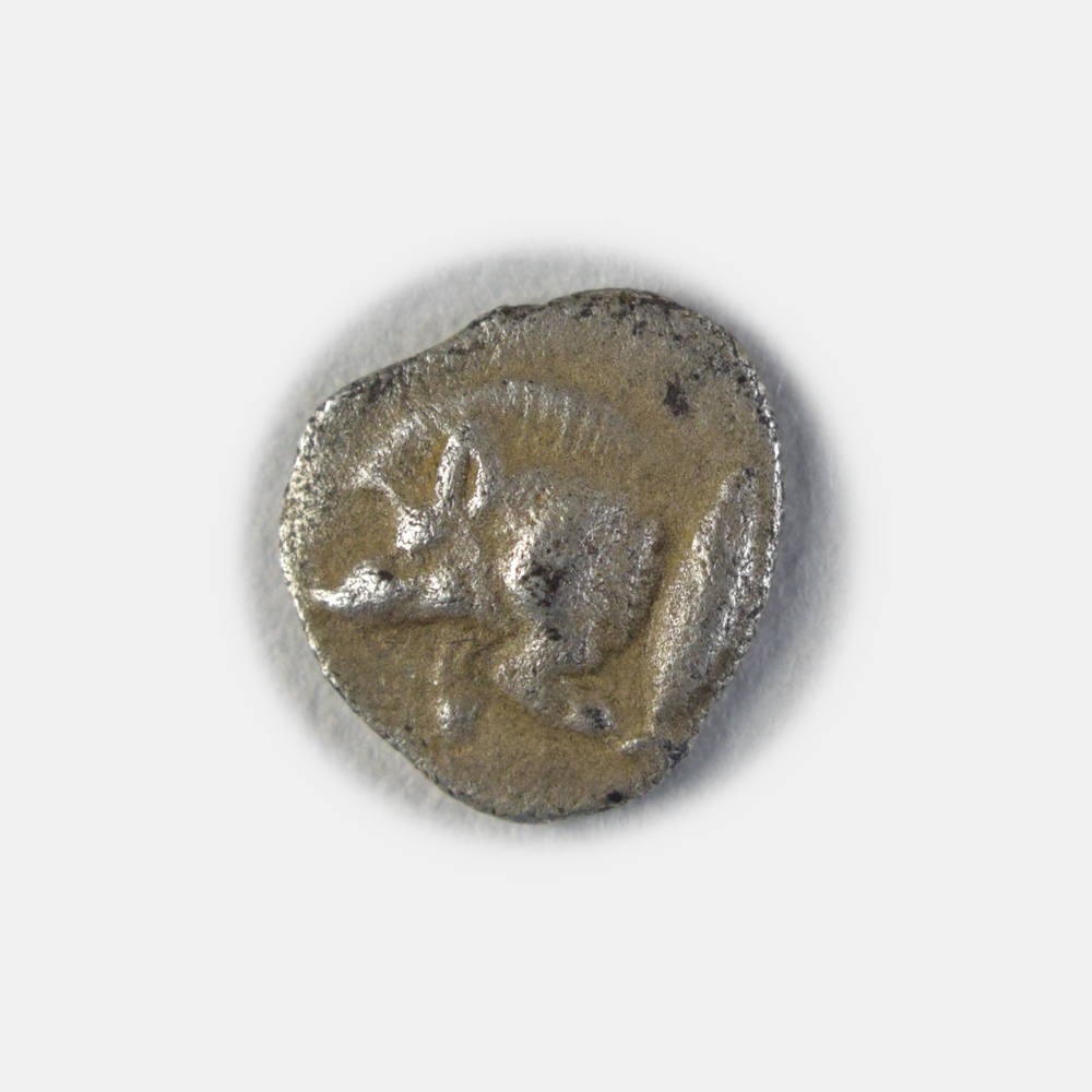Silver hemiobol of Kyzikos with classic lion’s head and forepart of boar with tunny fish design.
