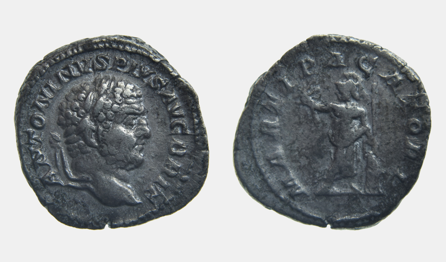 Caracalla., AR Denarius, AD 201-213. Rome. ANTONINVS PIVS AVG BRIT, laureate head right / MARTI PACATORI, helmeted Mars standing facing, head left, holding branch and spear, shield set on ground.