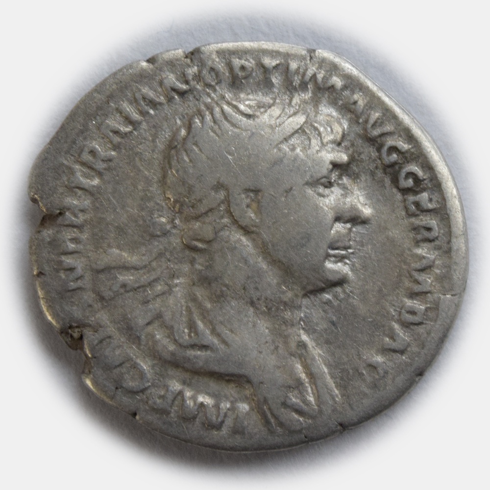 Trajan AR Denarius. Rome, AD 116-117. IMP CAES NER TRAIAN OPTIM AVG GERM DAC, laureate and draped bust to right / PART[HICO P M TR] P COS VI P P S P Q R, Providentia standing to left, pointing at large globe at feet on left and holding vertical sceptre, elbow resting on column; PRO-VID across fields.