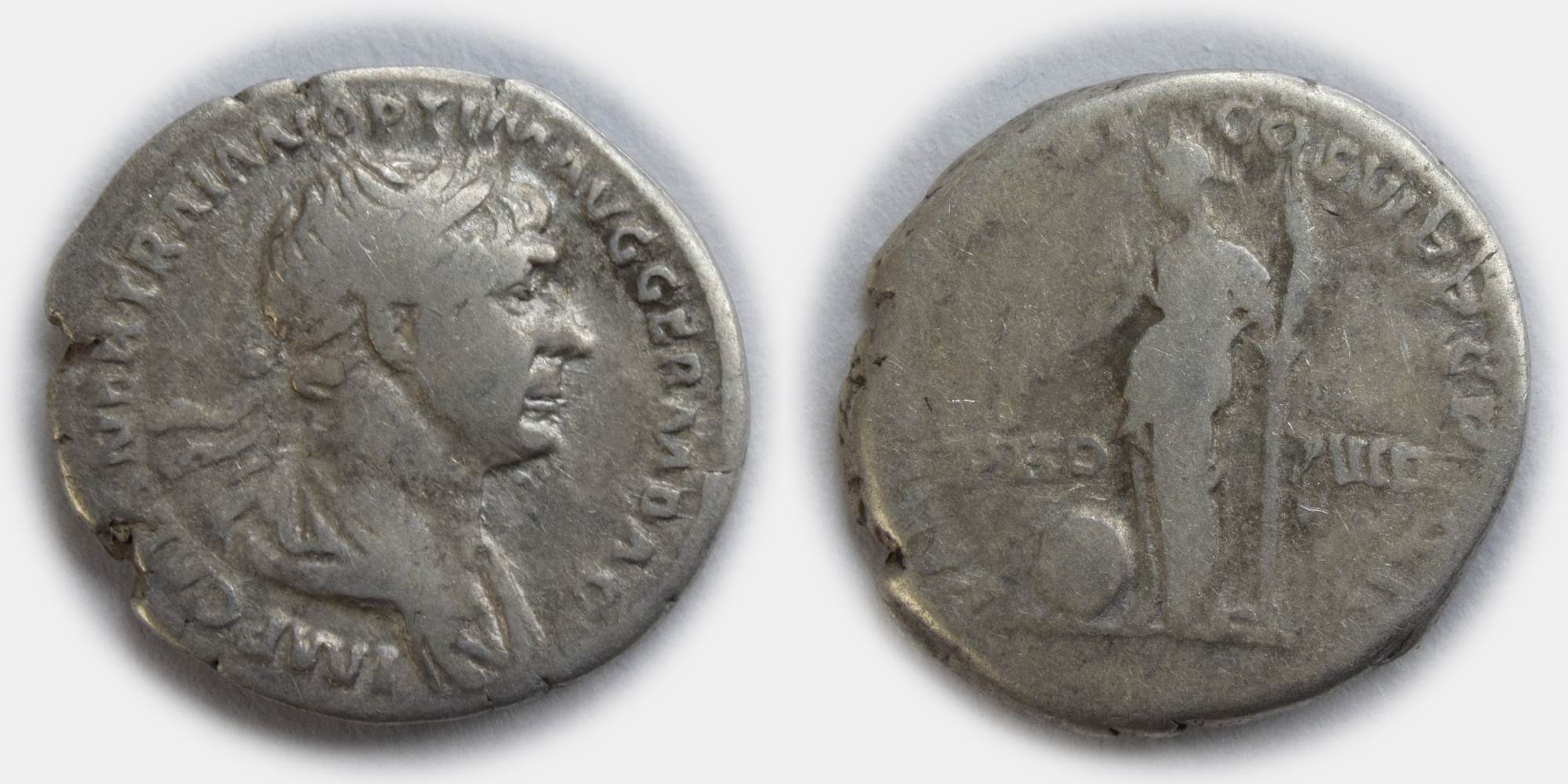 Trajan AR Denarius. Rome, AD 116-117. IMP CAES NER TRAIAN OPTIM AVG GERM DAC, laureate and draped bust to right / PART[HICO P M TR] P COS VI P P S P Q R, Providentia standing to left, pointing at large globe at feet on left and holding vertical sceptre, elbow resting on column; PRO-VID across fields.