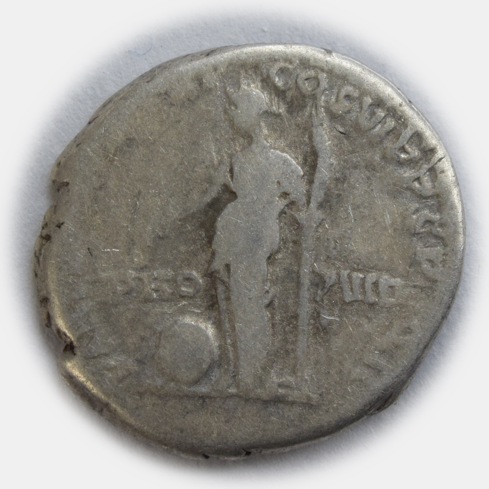 Trajan AR Denarius. Rome, AD 116-117. IMP CAES NER TRAIAN OPTIM AVG GERM DAC, laureate and draped bust to right / PART[HICO P M TR] P COS VI P P S P Q R, Providentia standing to left, pointing at large globe at feet on left and holding vertical sceptre, elbow resting on column; PRO-VID across fields.